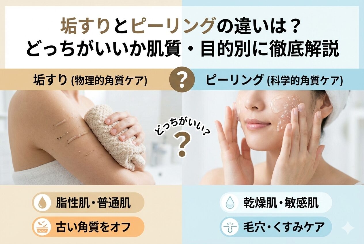 この記事では、垢すりとピーリングの仕組みの違いから、それぞれのメリット・デメリット、そして「今のあなたの肌にはどちらが合っているのか」を目的別・部位別に詳しく解説します。正しい知識を身につけて、トラブル知らずの滑らかな素肌を目指しましょう。