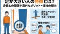 足が大きい人は、地面を捉える面積が広いため、重心が安定しやすいという特徴があります。これは、立っているときの姿勢保持や、歩行時の安定感につながります。