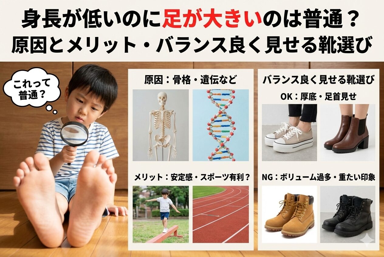 この記事では、なぜ身長に対して足が大きくなるのかという「原因」から、意外と知られていない「メリット」、そして明日から使える「バランス良く見せるファッションのコツ」までを徹底解説します。