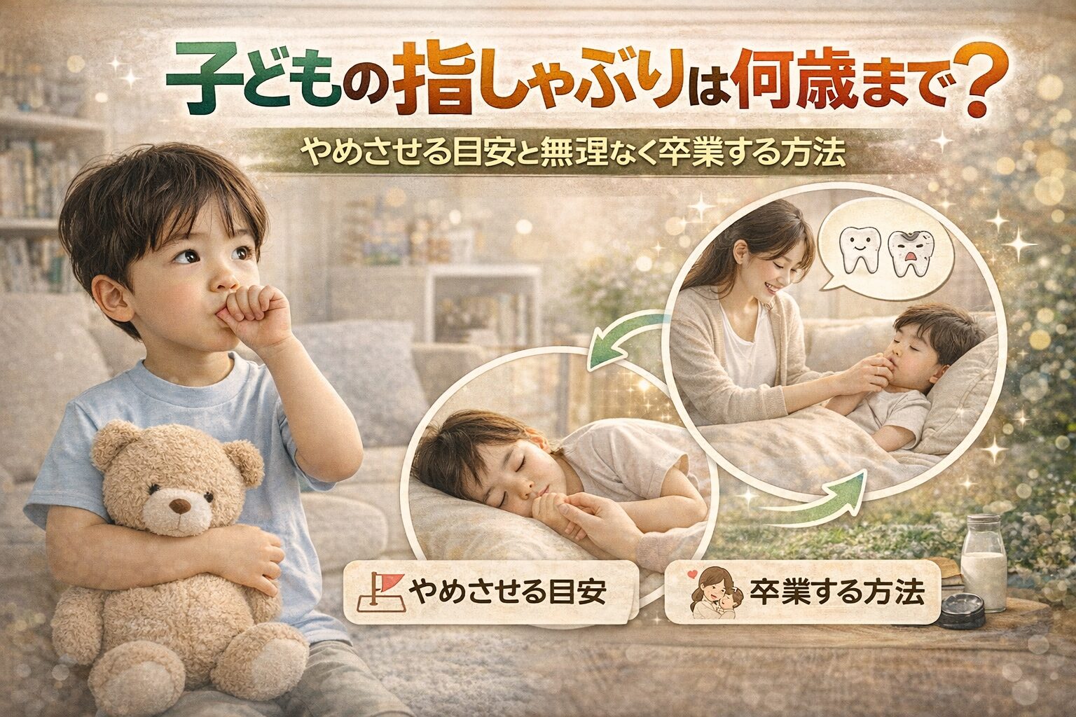 この3点を意識し、焦らずに取り組んでみてください。親子のスキンシップを増やし、子どもが安心感を得られる環境を作ることが、結果として指しゃぶり卒業への一番の近道となります。
