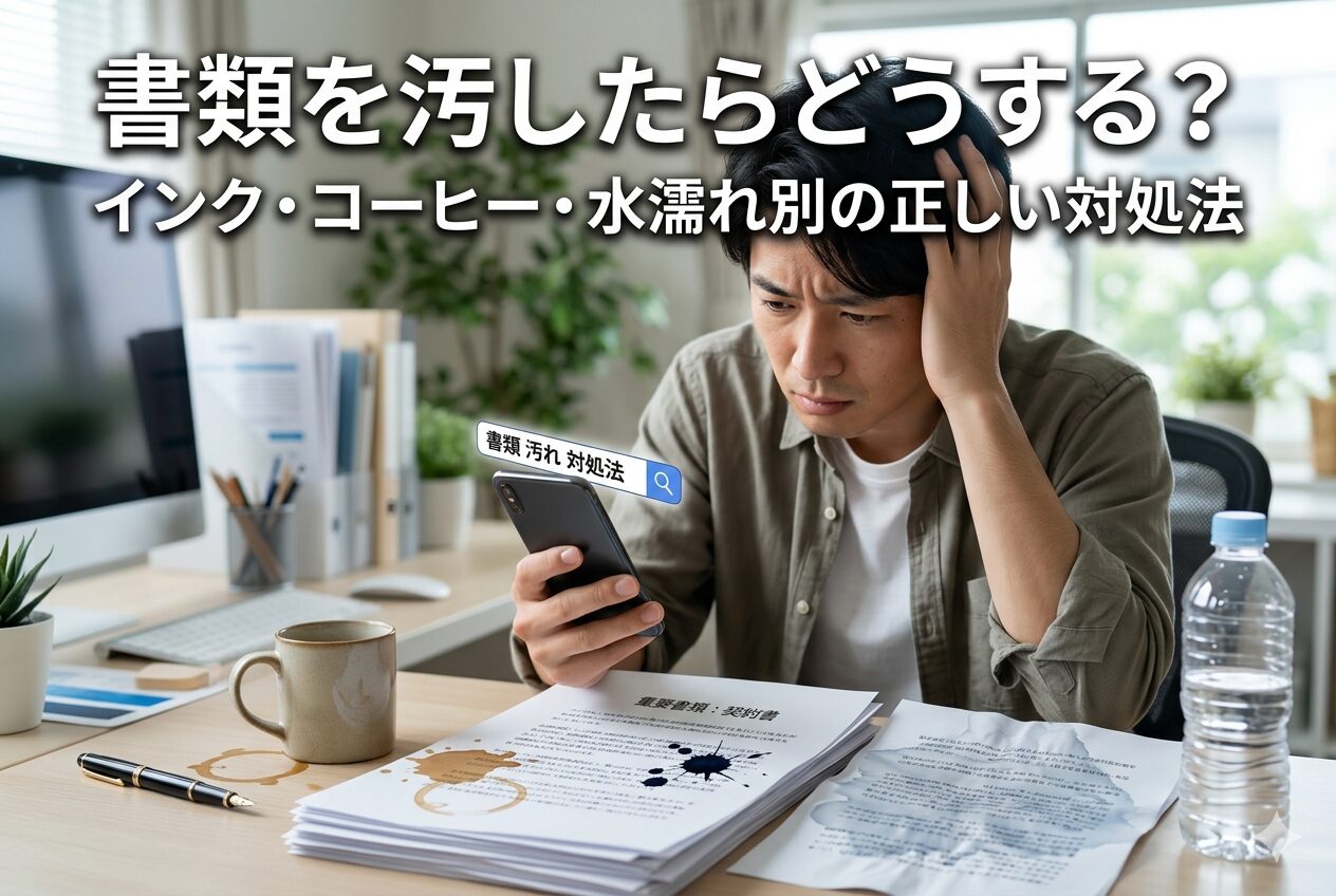 重要なのは、「焦らないこと」、そして「汚れた原因と書類の種類に合わせて正しい方法を選ぶこと」です。インク汚れ、コーヒーシミ、水濡れ、破れなど、それぞれの状況に応じた対処法を覚えておけば、いざという時に落ち着いて行動できるでしょう。